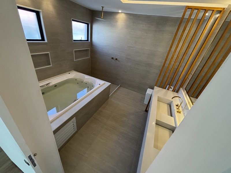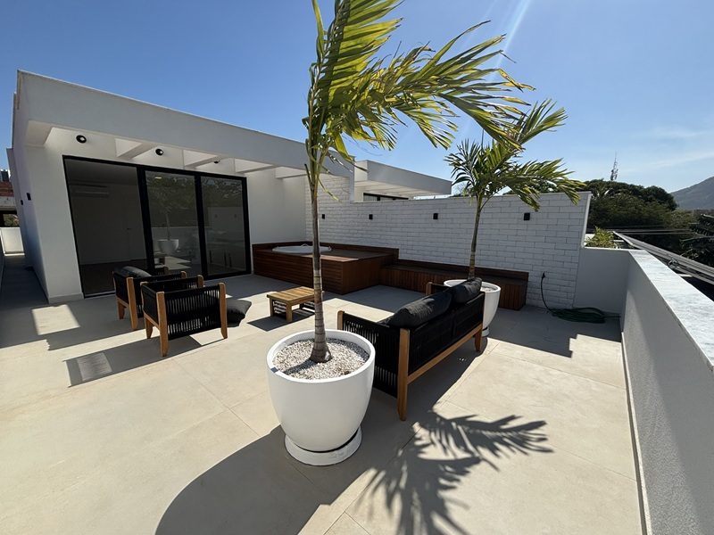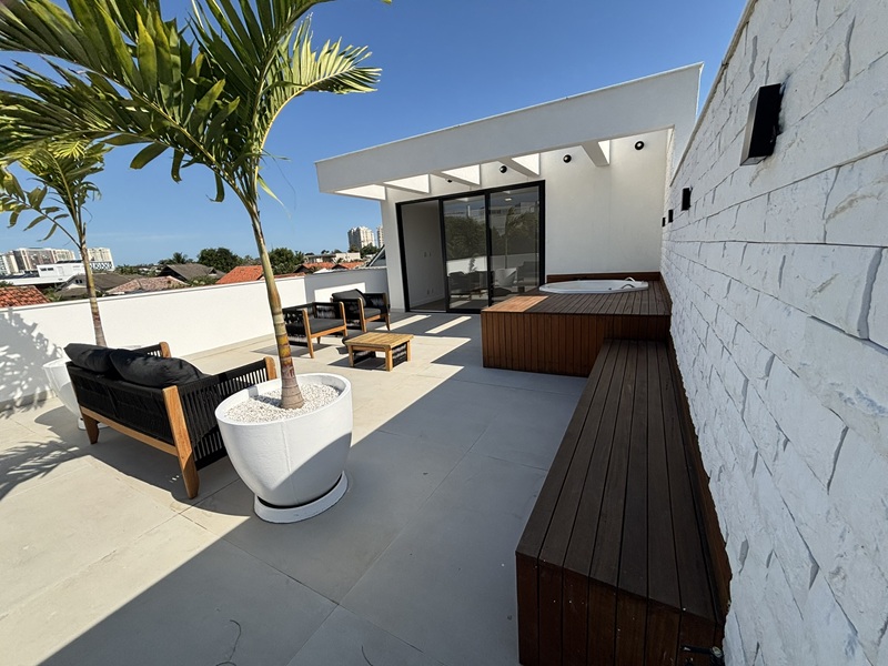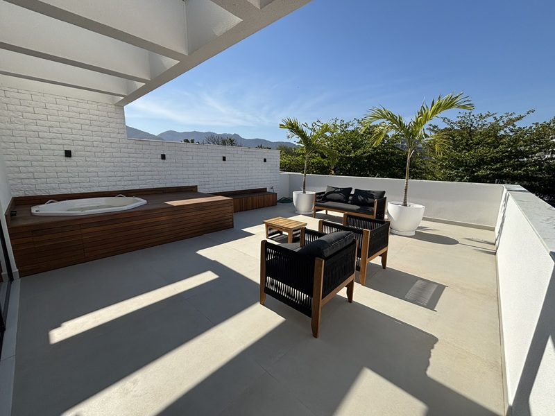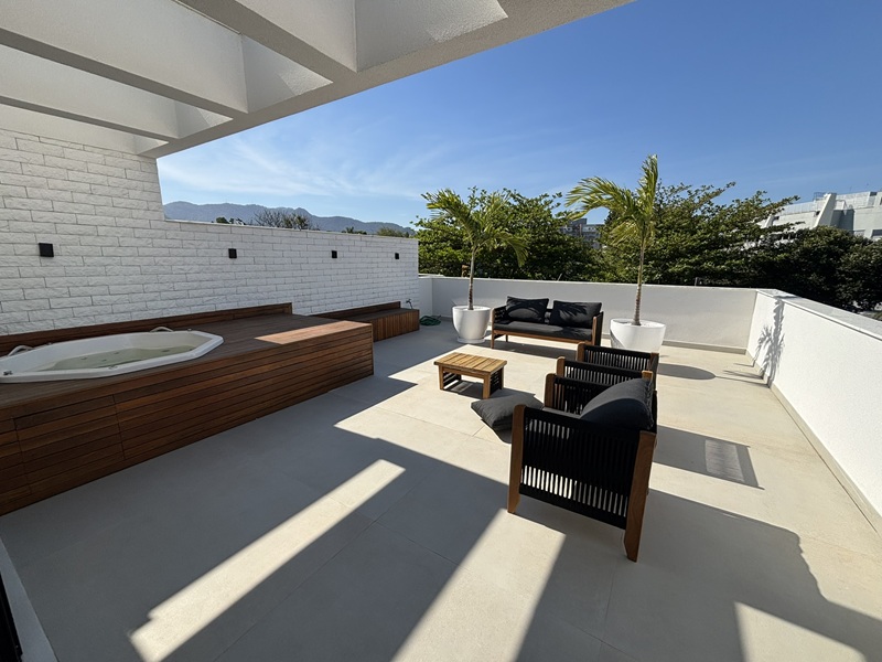 O terceiro pavimento dispõe de uma aconchegante sala de TV, mais uma suíte e uma área externa com hidromassagem sobre deck de madeira, ideal para relaxar.