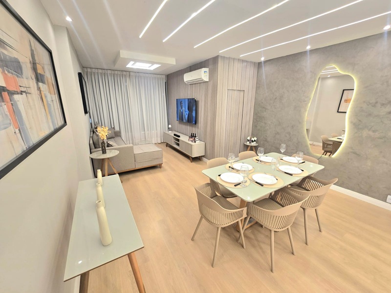 Flamengo – Edifício Gurupa – Magnífico apartamento totalmente reformado e mobiliado, medindo 120 m². Composto por sala em dois ambientes com painel ripado e iluminação indireta assinada, três quartos amplos (sendo 1 suíte master com closet), cozinha gourmet planejada com eletrodomésticos de embutir. Totalmente mobiliado e decorado com peças Rio Decor (sofás, mesas, camas, estofados, tapetes, quadros – tudo incluso!). Piso em porcelanato 90×90 italiano e