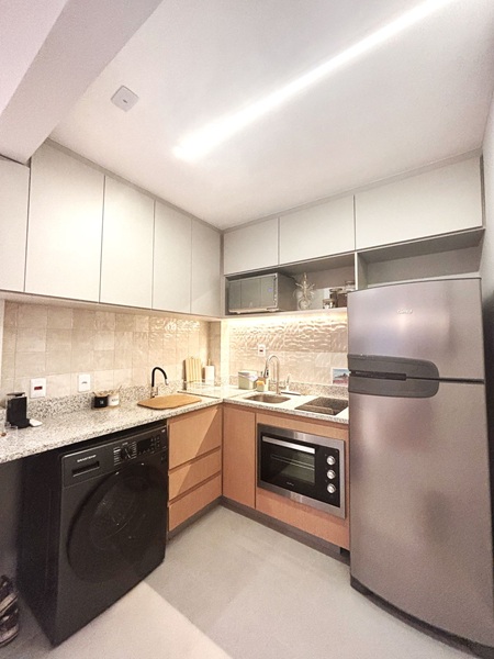 camas de casal nos dois quartos, sofá-cama na sala, mesa de jantar, mesa de canto, cadeiras, cabeceiras, escrivaninha, Smart TV 55”, geladeira, micro-ondas, forno, cooktop, máquina de café, lava e seca, cortinas, espelhos, quadros, tapetes, utensílios domésticos, enxoval 400 fios, toalhas e diversos outros itens.Condomínio aceita Airbnb. Portaria/Zelador com horário estendido (7h às 20h).